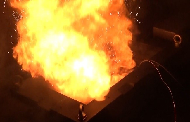 Essai de résistance à la flamme. Le matériau est soumis à différents niveaux de contrainte thermique, ce qui permet de réaliser une comparaison entre les différents matériaux composant le « casing » de la batterie.